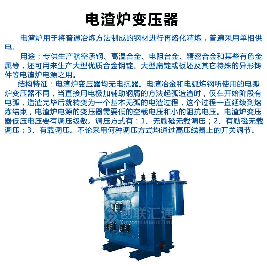 電渣爐變壓器電渣爐變壓器均無電抗器,專供生產(chǎn)航空承鋼、高溫合金、電阻臺金、精密合金和某些有色金屬等,還可用來生產(chǎn)大型優(yōu)質(zhì)合金鋼錠、大型扁錠或板坯及其它特殊的異形鑄件等電渣爐電源之用。